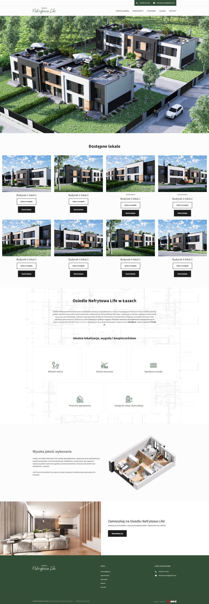 Strona internetowa dla dewelopera, służąca do przedstawienia oferty lokali na Osiedlu Nefrytowa Life. Witryna posiada model 3d, za pomocą, którego można wybrać konkretny lokal. Została dodana responsywność strony a także wdrożono system do zarządzania treścią.